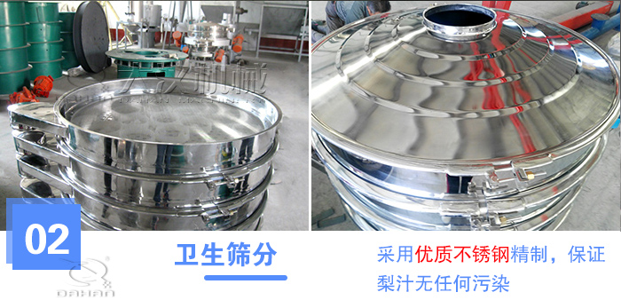 不銹鋼振動篩的篩分精度非常高,細(xì)可達(dá)0.028mm(500目),適用于各種液體和超微細(xì)粉末的篩分,可以保證梨汁的精準(zhǔn)篩分、過濾、除雜,同時篩網(wǎng)可以安裝1-5層,篩分出六種不同粒度規(guī)格的的梨汁,保證了梨汁的口感,能夠適用于客戶不同的需求,功能非常強(qiáng)大。