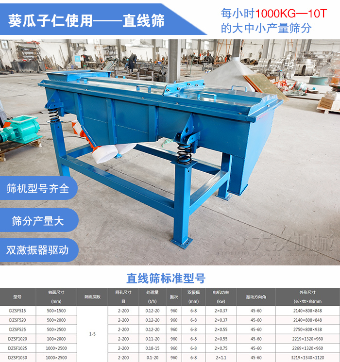 總結(jié):直線篩相比旋振篩的優(yōu)勢在于篩分產(chǎn)量上的提升,大型號的直線篩可滿足每小時10噸的產(chǎn)量求,大產(chǎn)量葵瓜子仁篩分就選直線篩!