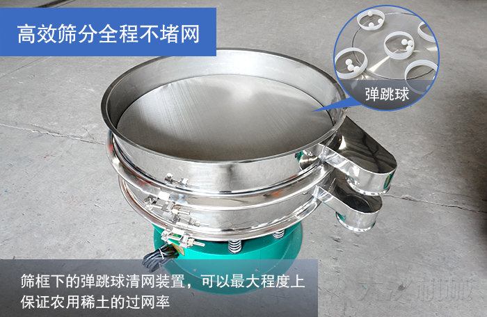 圓形振動篩通過振動電機上兩端的偏心塊將篩機運動轉(zhuǎn)化為三元運動對農(nóng)用稀土進行高效篩分,再加上篩框下的彈跳球清網(wǎng)裝置,可以很大程度上保證農(nóng)用稀土的過網(wǎng)率,高效篩分全程不堵網(wǎng)。