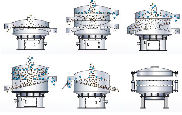 采用立式振動電機作為激振源,通過振動電機上下兩端的偏心重錘將旋轉(zhuǎn)運動轉(zhuǎn)變?yōu)樗健⒋怪?、傾斜的三次元運動,并傳遞到旋振篩的篩面上;物料通過入料口進入設(shè)備內(nèi),根據(jù)不同物料篩分要求,物料經(jīng)過1-5層采用不同目數(shù)的金屬編織篩網(wǎng)的篩分層,在這個過程中,位于各層的篩網(wǎng)下的清網(wǎng)裝置(硅膠彈跳球)通過頻率振動不斷撞擊篩網(wǎng),使篩網(wǎng)上層物料能夠順暢的透網(wǎng)篩分,并有效解決了物料堵網(wǎng)問題出現(xiàn),不同目數(shù)的物料通過各層對應(yīng)目數(shù)的篩網(wǎng)后在各層的出料口排出,終實現(xiàn)篩選除雜或過濾分級的目的。