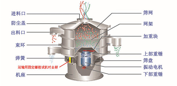 圓形旋振篩工作原理:物料從設(shè)備的進(jìn)料口進(jìn)入在振動(dòng)電機(jī)的作用下使物料在篩網(wǎng)網(wǎng)孔的篩選后完成篩分目的。