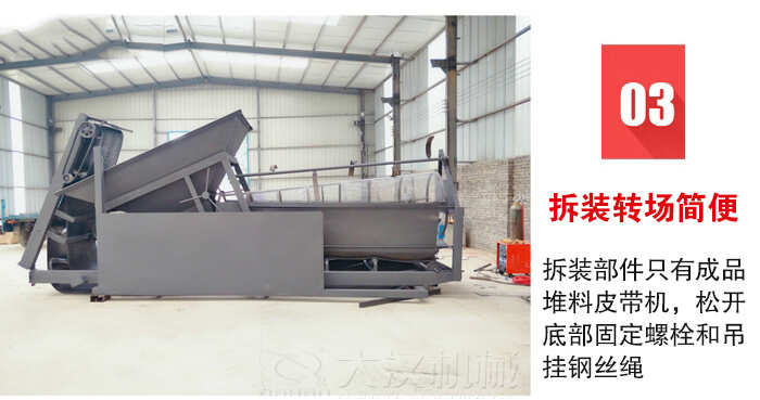 設備的高度整體性便于施工現(xiàn)場存放或轉場運輸,拆裝部件只有成品堆料皮帶機,松開底部固定螺栓和吊掛鋼絲繩,將成品皮帶機塞入主框架底面即可。