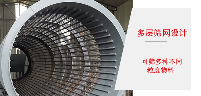 4、采用多層篩網(wǎng)設(shè)計,可篩多種物料。篩下產(chǎn)品大小于100mm,中間10~50mm,細可達≤3mm以下。