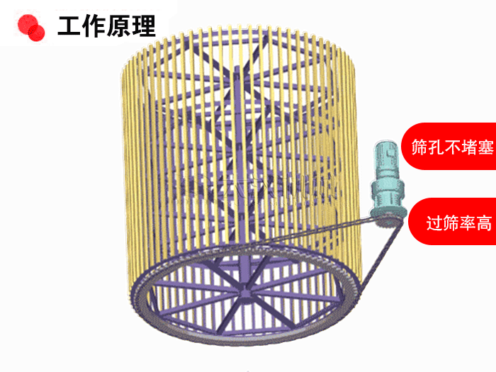 該產(chǎn)品的主要依靠驅(qū)動(dòng)裝置帶動(dòng)滾筒篩網(wǎng),對(duì)于物料做360°旋轉(zhuǎn)時(shí)篩分,在滾動(dòng)篩網(wǎng)的作用下,物料能夠輕松的達(dá)到分散的狀態(tài),從幫助篩網(wǎng)進(jìn)行快速的篩分。通過(guò)篩網(wǎng)網(wǎng)孔的物料留到皮帶輸送機(jī)上,由出料口排出,而沒(méi)有通過(guò)篩網(wǎng)篩分的將從肥料口排出,從而完成物料的篩分目的。