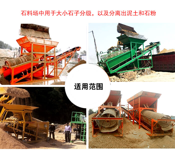 滾筒篩土同時對物料的適應(yīng)能力強,粘性、濕度大、臟、雜等各種性質(zhì)的物料都能篩分。石料場中用于大小石子分級,以及分離出泥土和石粉?;みx礦行業(yè)用于大小塊狀物分級及分離粉狀物質(zhì)。
