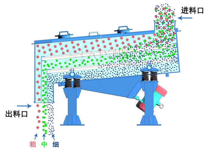 篩料機(jī)底部的雙振動(dòng)電機(jī)使篩面上的物料受其激振力的作用,向出料口方向跳躍式直線運(yùn)動(dòng),小于篩孔的物料落到下層,徑出料口排出。