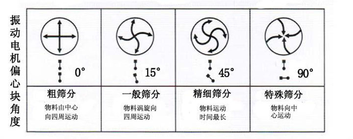 當上下偏心塊調至45度時,物料呈快速漩渦狀分散,用來篩分精細物料。