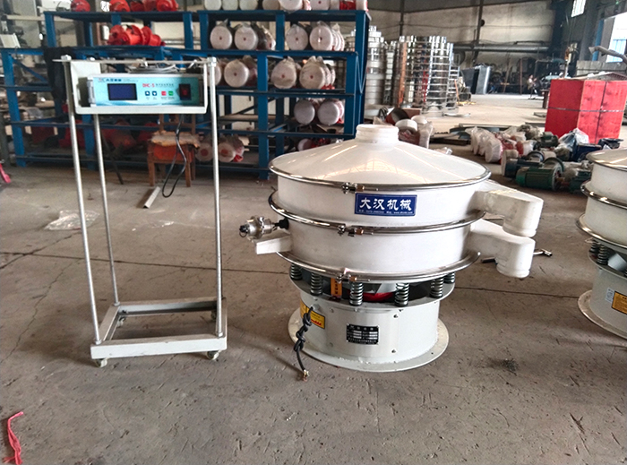 塑料防腐蝕振動篩采用YZUL立式振動電機作為激振源,通過振動電機上下兩端的偏心重錘將旋轉(zhuǎn)運動轉(zhuǎn)變?yōu)樗?、垂直、傾斜的三次元運動,并傳遞到旋振篩的篩面上;物料通過入料口進入設(shè)備內(nèi),根據(jù)不同物料篩分要求,物料經(jīng)過1-5層采用不同目數(shù)的金屬編織篩網(wǎng)的篩分層,在這個過程中,位于各層的篩網(wǎng)下的清網(wǎng)裝置(彈跳球)通過頻率振動不斷撞擊不銹鋼篩網(wǎng),使篩網(wǎng)上層物料能夠順暢的透網(wǎng)篩分,并有效解決了物料堵網(wǎng)問題出現(xiàn),不同目數(shù)的物料通過各層對應(yīng)目數(shù)的篩網(wǎng)后在各層的出料口排出,終實現(xiàn)篩選除雜或過濾分級的目的。