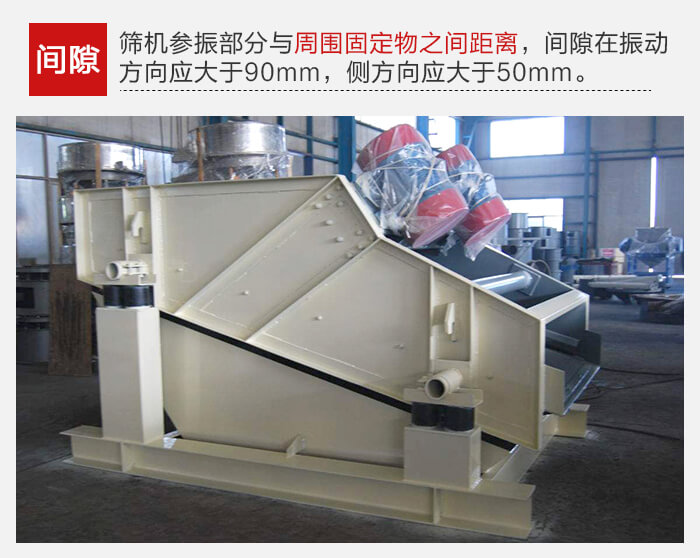篩機各部分連接必須牢固可靠,所有螺栓不得有松動。篩機上參振部分與周圍固定物之間的間隙在振動方向應大于90mm,在側(cè)方向應大于50mm.