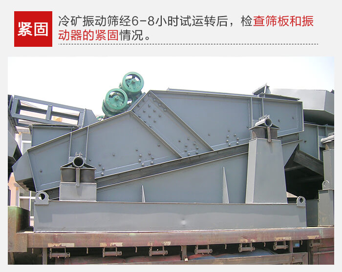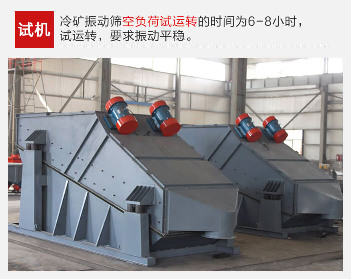冷礦振動篩空負荷試運轉(zhuǎn)的時間為6-8小時,試運轉(zhuǎn),要求振動平穩(wěn),無橫向擺動及不正常響聲。如發(fā)現(xiàn)上述問題,應及時檢查原因,排除故障。